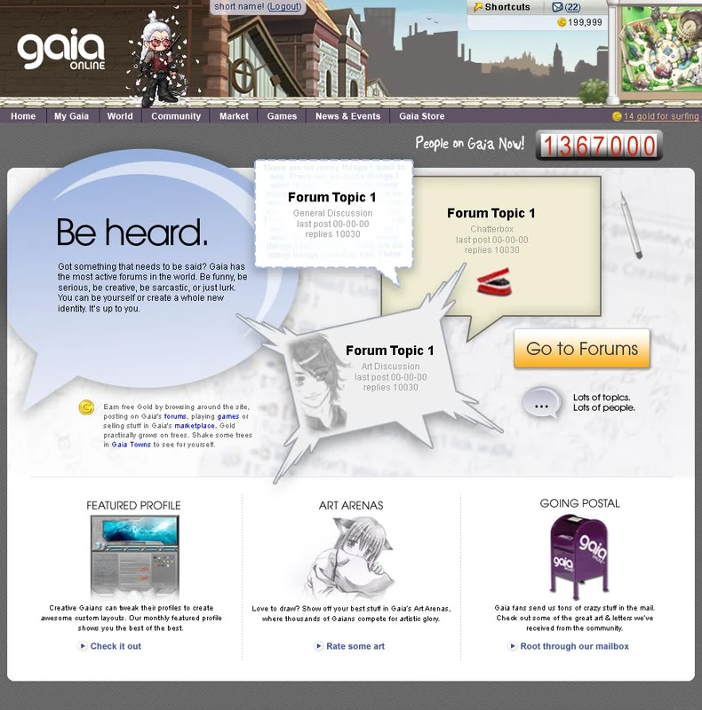 Besides the focus on trying to get new members, this year also had many updates that focused on the Gaia Community, thus the Gaia Daily (eventually called Community Spotlight) was created, these announcements were to bring focus to various the actives of Gaians around the site; such as guilds, shops and project threads. There were also contests, weekly polls, and Daily Chance to participate in. But the shift from a Anime / Manga / RPG inspired site was slowly transitioning to a more Social Network inspired site. More features and updates that would attract a more social network crowd were the VJ (upgraded), Gaia OMG (spanned to Facebook), Celebrity Snare, Gaia Badge (could be used as a forum signature on other sites), the Labelmaker, and the staying power of Scion cars, MTV, and Skittles. Although most Gaians didn't consider the changes and additions acceptable, these changes were necessary and an attempt to balance out the rising cost of keeping the site running and free. As the new Battle System (eventually called zOMG!) was quickly coming to add to the cost.